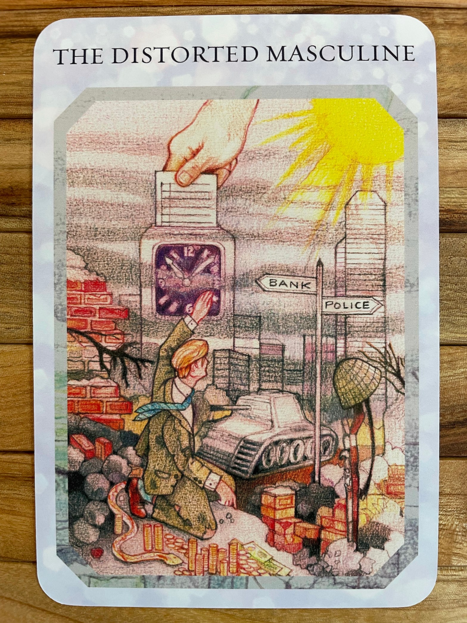 TRUE LOVE READING CARDSの10枚目のカードは THE DISTORTED MASCULINE 歪んだ男性性 戦地でこの男性はお金を数えている… 少しカオスな状況が描かれていますね。 ここでは富や権続きを読む “THE DISTORTED MASCULINE 歪んだ男性性”